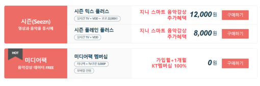 KT의 경우 LG U+ 보다는 조금 혜택이 다양하게 구성되어 있습니다. ‘시즌’ 이라는 패키지를 통해 영상도 함께 누릴 수 있다는 점이 특징입니다. 또한 KT는 데이터 프리 서비스를 이용하려면 ‘지니팩’ 이라고 쓰여 있는 팩을 이용하셔야 합니다.