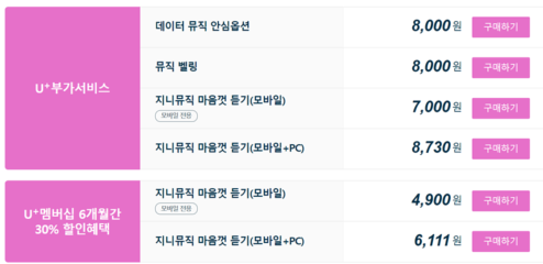 상품 종류는 이렇게 있습니다. 부가서비스에서 가장 많이 사용하시는 것은 ‘지니뮤직 마음껏 듣기’ 서비스입니다. pc와 모바일 모두에서 많이 들으시는 경우에는 pc+모바일 서비스를, 모바일에서만 들으시는 경우에는 모바일 서비스를 이용하시면 될 것 같습니다.
