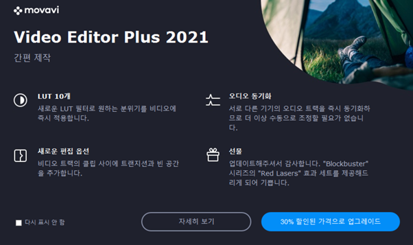 모바비 비디오 에디터를 열자마자 위와 같은 메시지가 나옵니다. 2021 버전으로 업그레이드 하라는 내용입니다. 저는 현재 성능에 만족하기 때문에 다시 표시 안 함을 선택했습니다. 체험판을 사용하실 경우에도 위와 같이 할인 가능한 창을 자동으로 띄워주니 바로 들어가서 저렴하게 구매하시면 됩니다.