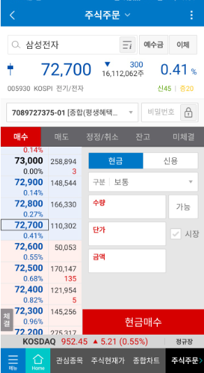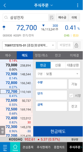 삼성전자를 검색하니 이렇게 삼성전자의 주식현재가가 나옵니다. 주식현재가를 검색하신 주식들은 아까 처음 보여드렸던 앱 화면과 같이 관심종목으로 첫 페이지에 전부 나오게 되어 아주 편리합니다. 70,000원대를 넘은 삼성전자의 모습입니다.