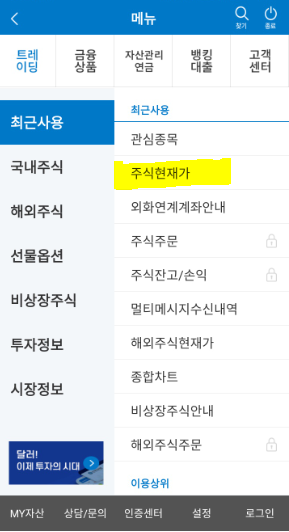 바로 주식 사는 법부터 알려드리도록 하겠습니다. 주식 파는 법도 똑같습니다. 왼쪽 아래에 있는 MY자산을 누르면 위와 같은 화면이 나옵니다. 그리고 나면 오른쪽에 있는 <주식현재가>를 선택해주세요.
